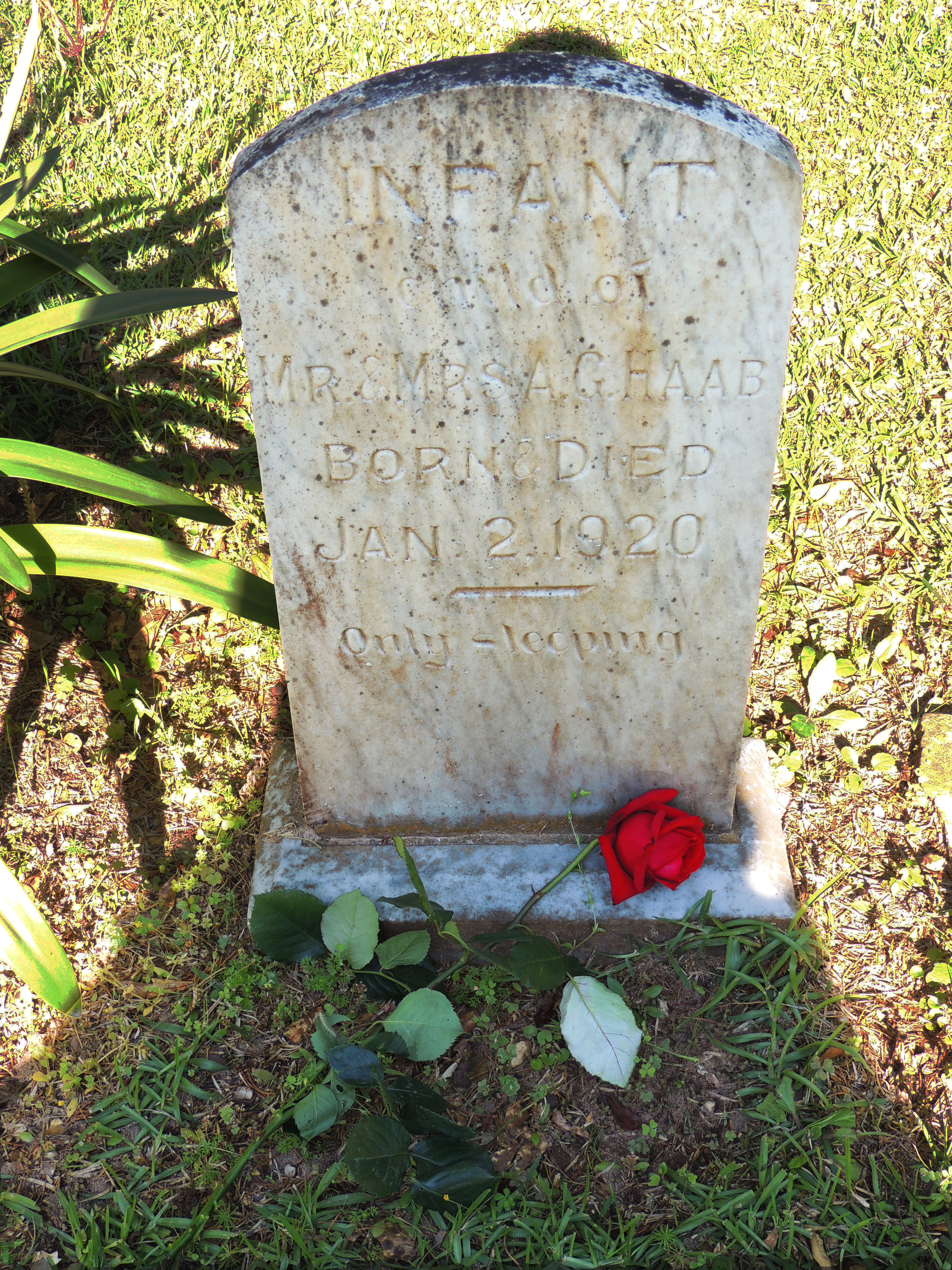 Back to that day in the Holland Cemetery, which has given a new memento mori. It’s a photo of a headstone that says: Infant Child of Mr. & Mrs. A. G. Haab, Born and Died, January 2, 1920, Only sleeping…