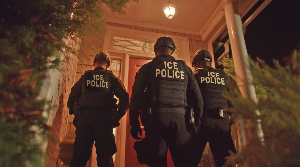 Three ICE agents were standing in the glow of our porch light, one slightly in front of the others. They were dressed in black with bullet proof vests. Pistols, radios, and handcuffs hung from their utility belts. Emblazoned on their chests in white block letters were the words ICE POLICE. They wore dark masks.